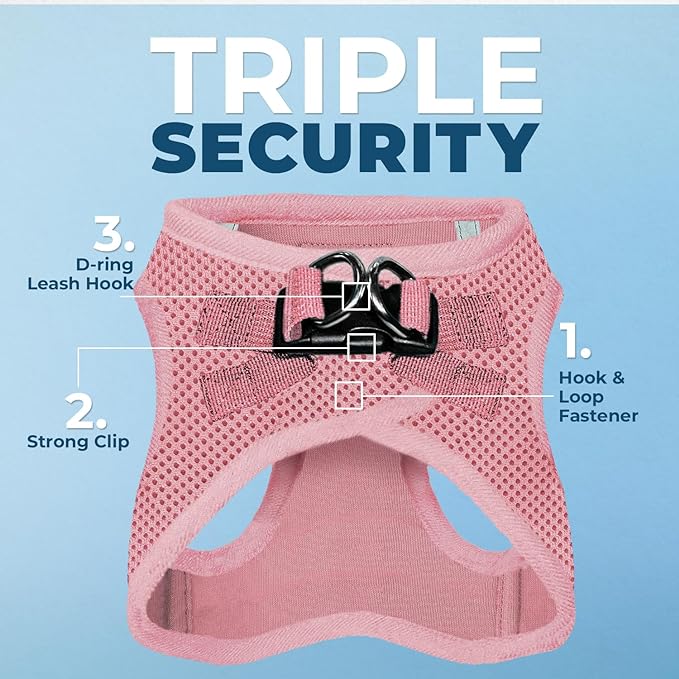 - THREE SAFETY FEATURES: Our hook and loop fastener, buckle and double D-rings work together protect your pet in three layers of security.