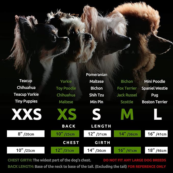 - FOR SMALL DOGS OR CATS. Please priority follows the chest size. Size XXSmall, fits 8" back,10" chest. Recommended for Chihuahua, Teacup Yorkie, Toy Poodle, Miniature Pomeranian, tiny puppies, mini breeds and little kitten.