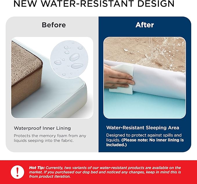 - Hot Tip: Since October 2024, we’ve made intuitive upgrades to our dog bed. The new variant no longer includes an inner waterproof lining—but has an exterior waterproof cover to prevent larger spills and liquids from damaging the product. While the original variant has as a waterproof interior lining to prevent liquids from seeping into the fabric. If you noticed any changes, keep in mind this is from product upgrades. Both variants work effectively when preventing damages from liquids.