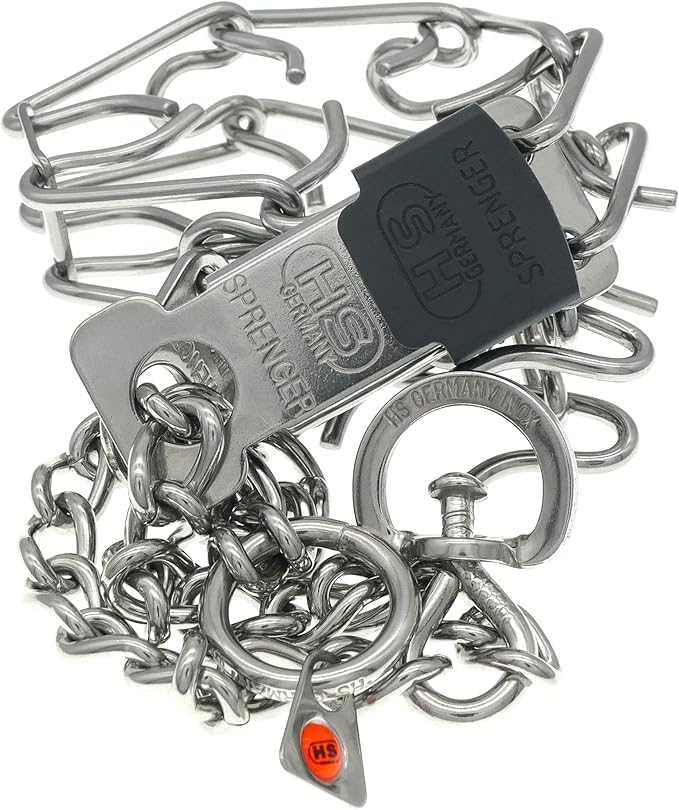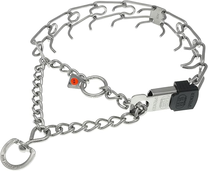 - Herm Sprenger Stainless Steel Prong Collar: ClickLock buckle for easy on and off. Fits necks up to 19 inches. Adjustable 23 inch length with three point two millimeter wire by adding or removing links.
