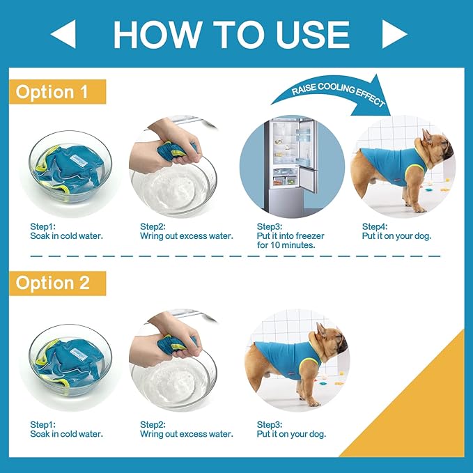 - HOW TO USE--1.Wet the shirt and wring out the water; 2.Put the shirt into freezer for 10 minutes; 3.Take out the shirt from freezer and put it on your dog.