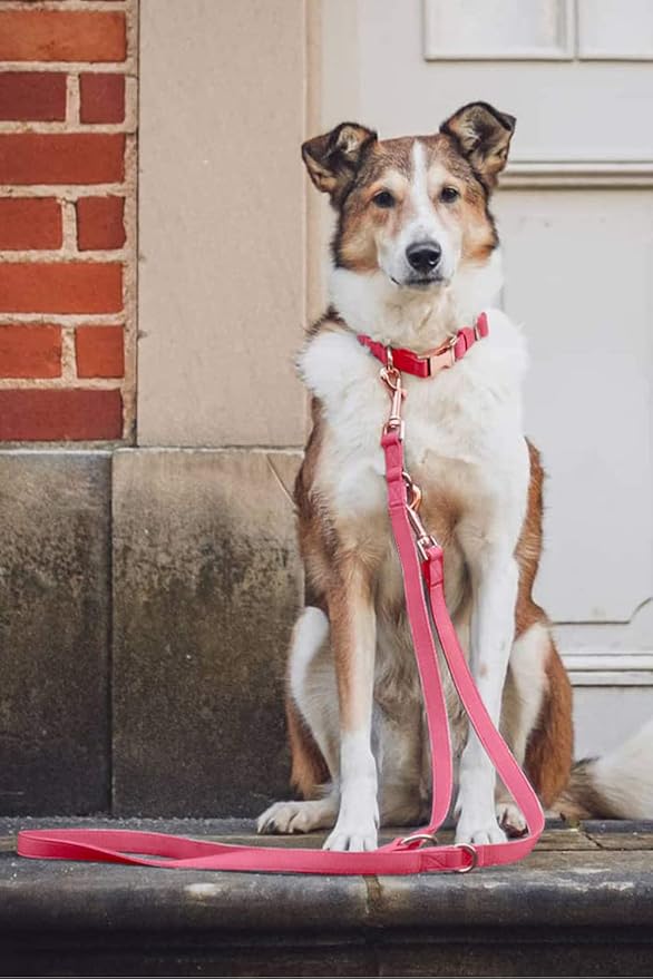 - š¾ DOG COLLAR AND LEASH COMBO SET - The set comprises of a dog leash (6 ft) and a perfectly matching adjustable dog collar. Combination design of timeless zinc alloys rose gold buckle D-ring and classy leather makes it particularly elegant and stylish. High-level appearance of this chic collar can instantly catch people's eye and make your adorable dog stand out from the crowd, get more praise.