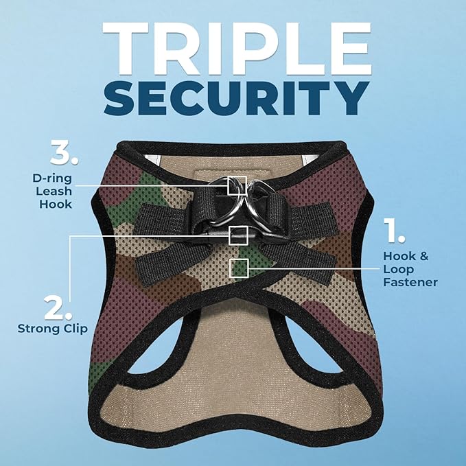 - THREE SAFETY FEATURES: Our hook and loop fastener, buckle and double D-rings work together protect your pet in three layers of security.