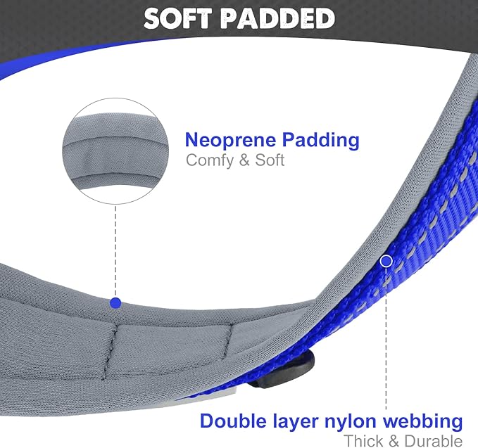 - Neoprene Soft Padding: The neoprene padded dog collar features extremely soft for comfy wear and can absorb the shock when wearing or pulling. Also, come with quick-dry and odor resistance. You never worry about odor or water on the collar