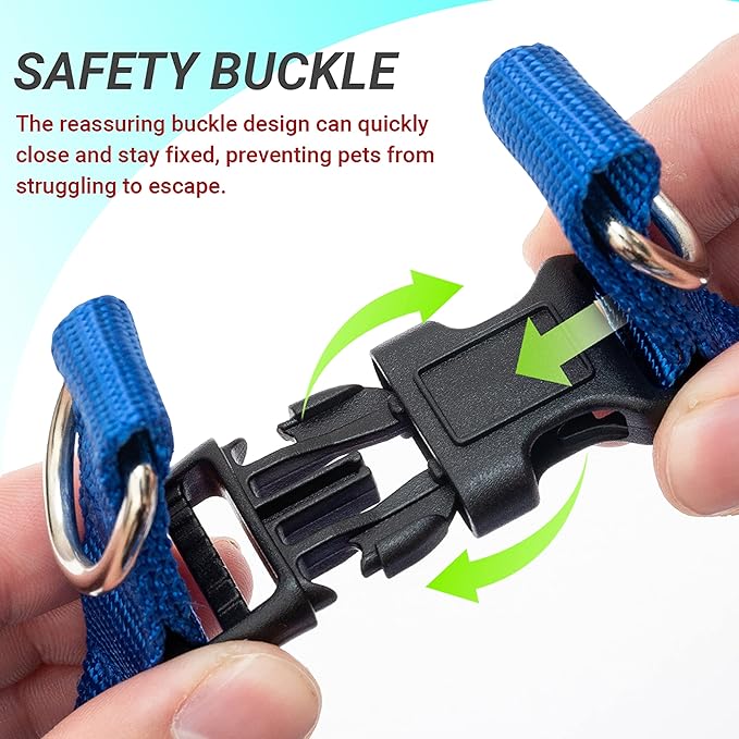 - Metal fittings make the dog harness more secure, this dog harness has two welded heavy duty O-rings attached to the nylon straps. Each nylon strap adopts a special figure-8 stitching technology, which will not fall off easily. In addition, the dog harness has a safety buckle that can be quickly closed and securely fastened, and can be quickly released when manually operated, making it easy to put on and take off. Prevent the dog from being frightened and struggling to escape