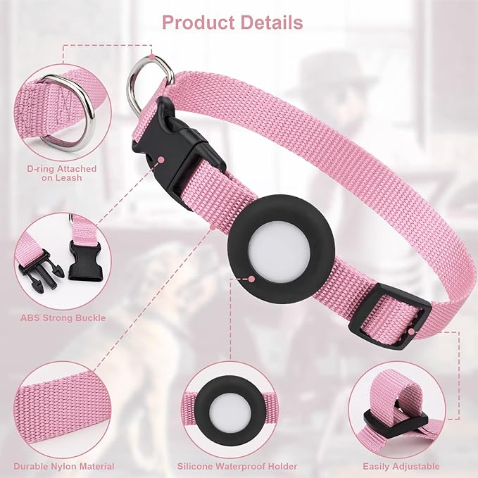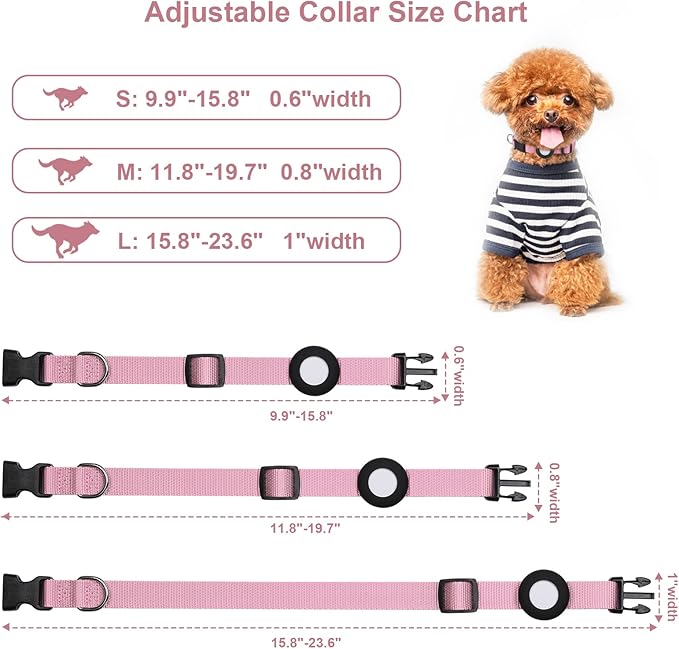 Adjustable AirTag Collar with Durable Quick Snap Buckle, Imitation Nylon Collar with Waterproof Apple Airtag Holder for Small Dogs (6"-16", Pink)