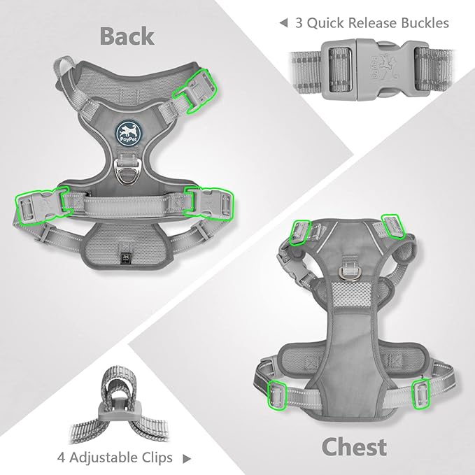 PoyPet No Pull Dog Harness, No Choke Reflective Dog Vest, Adjustable Pet Harnesses with Easy Control Padded Handle for Small Medium Large Dogs(Gray,M)