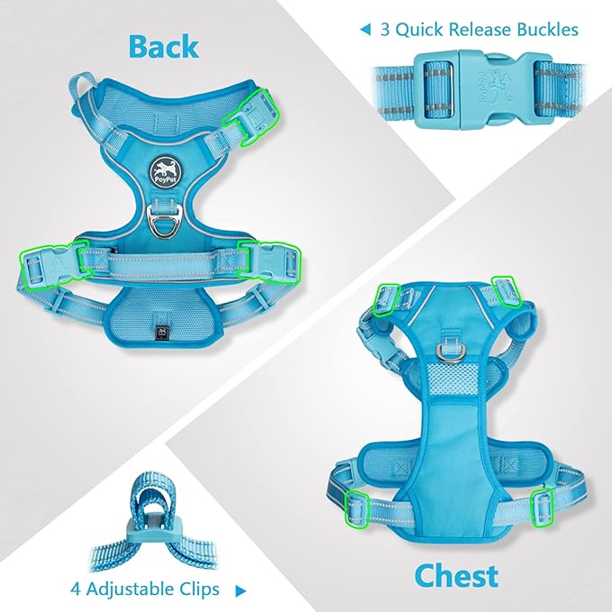 PoyPet No Pull Dog Harness, No Choke Reflective Dog Vest, Adjustable Pet Harnesses with Easy Control Padded Handle for Small Medium Large Dogs(Blue,S)