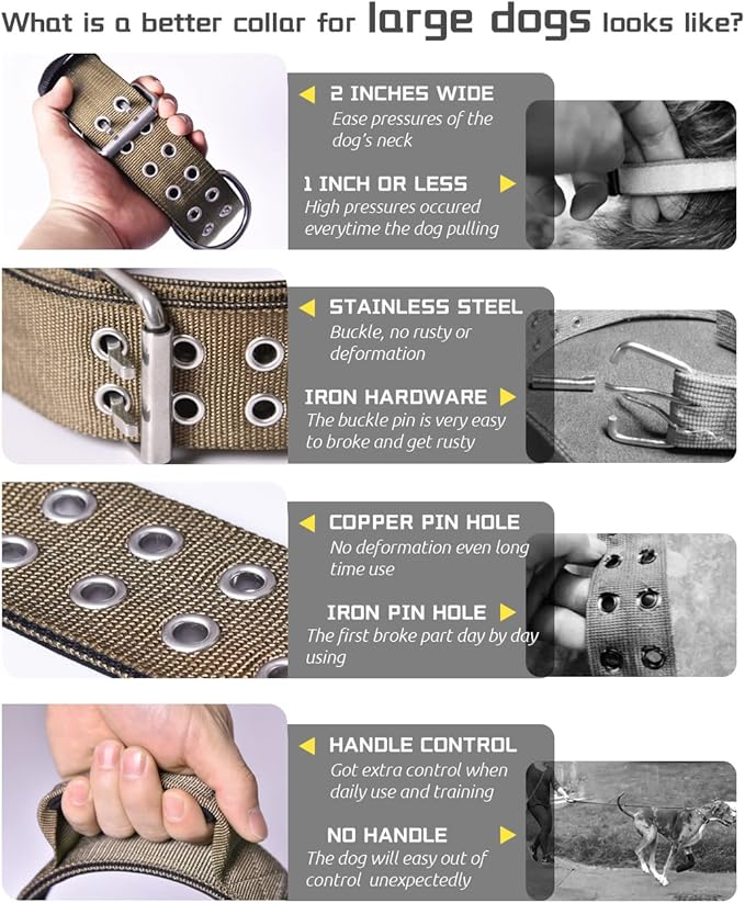 - ULTIMATE STRENGTH - 2" wide and approx. 1/3" thick tactical collar with 5 layers quality military nylon material, 6mm diameters stainless steel hardware, excellent tear strength for all breeds big dogs expecially heavy pullers. Pin buckle comes more secure than cobra buckle, free worry of broken by your dog