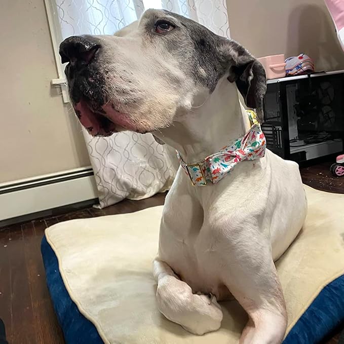 - CUTE DINOSAUR BOW TIE COLLAR: Adorable dinosaur collar is beautiful. Bowtie is detachable and well-made with elastic loops that let you take the bow tie off and on with ease.