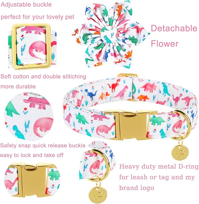 - CUTE DINOSAUR FLOWER COLLAR: Adorable dinosaur collar is beautiful. Flower is detachable and well-made with elastic loop that let you take the flower off and on with ease.