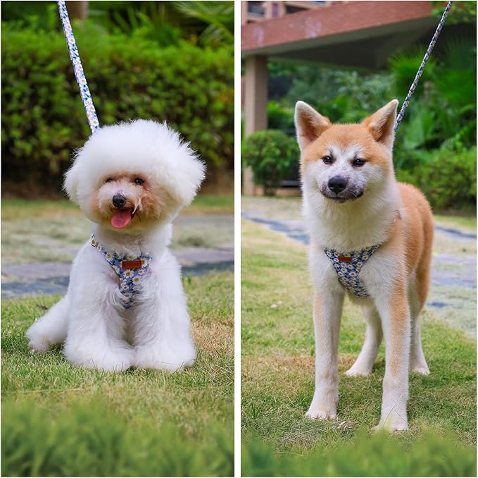 - HIGH-QUALITY MATERIAL: Our dog harness is made of high-quality cotton and microfiber, which is soft, comfortable and breathable, will not harm the dog's skin and hair, and provide a comfortable use experience. At the same time, the metal material of the small dog harness and leash set is sturdy and durable, will not fade and deform, will not rust when exposed to water, and has a longer service life.