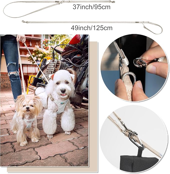 - Dog leash:Puppytie’s dog harness is equipped with a multi-functional leash, which can be adjusted in two lengths of 49inch and 37inch. You can use it to easily carry two dogs out. It has the function of carrying keys or garbage bags. The function of wait in place allows dogs to wait in place quickly and safely