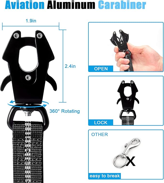 - AUTO LOCK FROG CLIP—The 360° Rotating Frog Clip is made of Aviation Aluminum,can hold up to 400 pounds. Quick release and locking dog harness clip while holding tight under strong pull. 360°rotatable to prevent the dog leash from twisting and knotting.