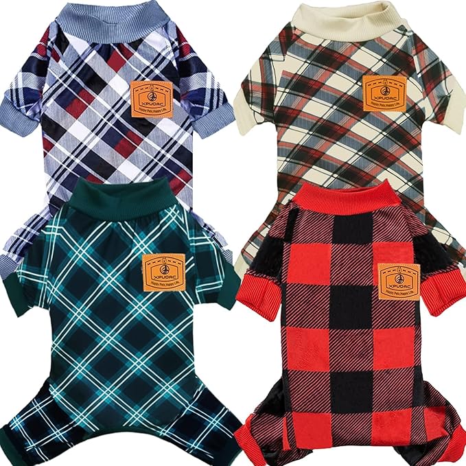 XPUDAC 4 Pack Dog Pajamas for Small Dogs Cats Plaid Doggie Clothes Puppy Onesies Christmas Pajamas Jumpsuits Pet Pjs Shirt Apparel 2X-Large, Red Green Khaki Grey