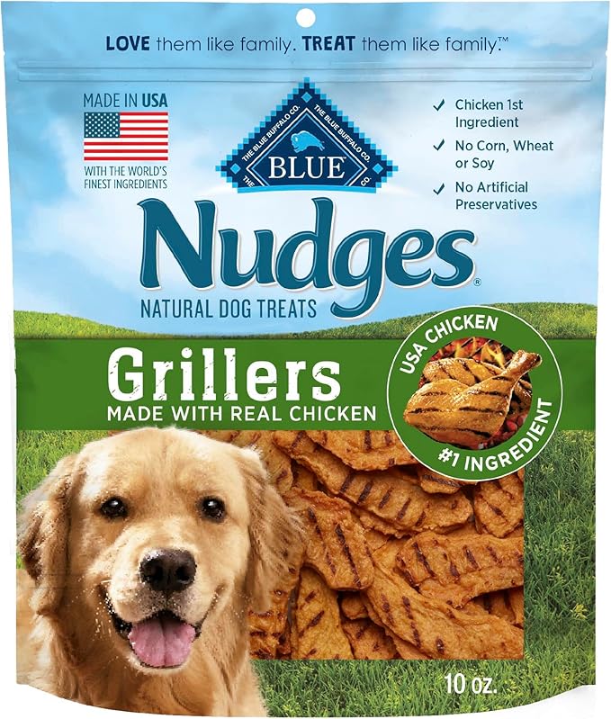 - Contains: One 10-oz bag of Blue Buffalo Nudges Grillers Natural Dog Treats; Chicken Recipe