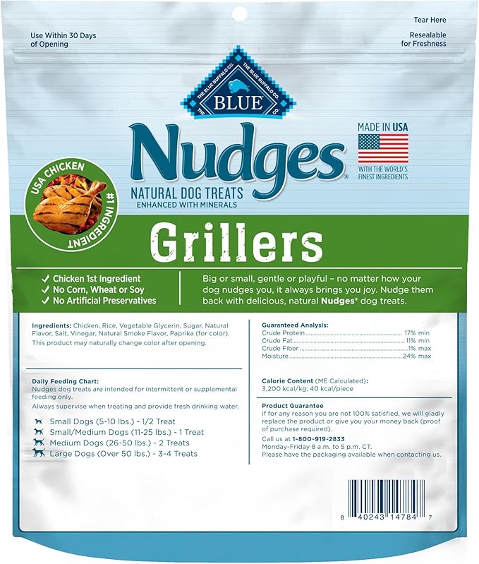 - Contains: One 10-oz bag of Blue Buffalo Nudges Grillers Natural Dog Treats; Chicken Recipe
