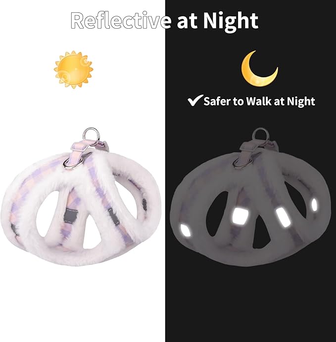 - WARM PLUSH & SAFE - Made with soft imitation rabbit hair, super fluffy, warm and more comfortable, this lightweight pet harness is perfect for walks in autumn and winter. The vest-style design disperses the pressure through shoulders and chest, uniform force, no need to worry about the danger of suffocation or choking.Our hook and loop fastener, buckle and D-rings work together protect your pet in triple security.