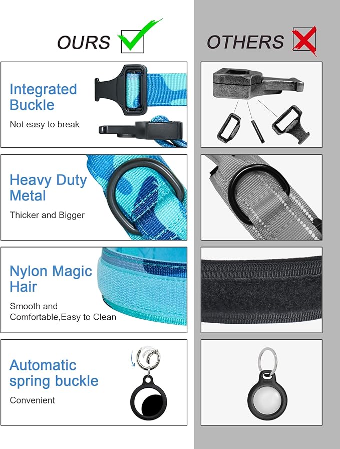 - 【Airtag Holder and Patches】The airtag dog collar comes with 1 airtag holder and 2 patches. The airtag cover can hold an airtag tracker to prevent pet from getting lost. It is waterproof and easy to clean. On the back of the collar, you can place your name tag, ID card, or any velcro accessory; the dog-bone design of the reflective patch will ensure your dog be seen in low light conditions, making it safer!The flag sticker make it tactical.