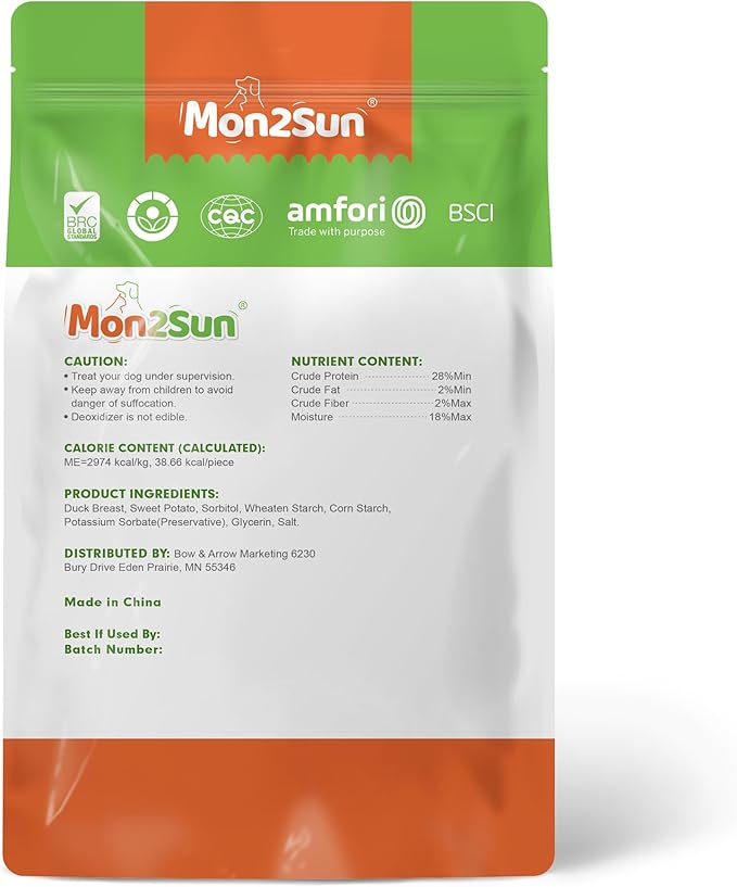 - [Safe Ingredients] MON2SUN dog treats are majorly made of duck and sweet potato. Each ingredient undergoes rigorous inspection to ensure the utmost safety for your furry family member.