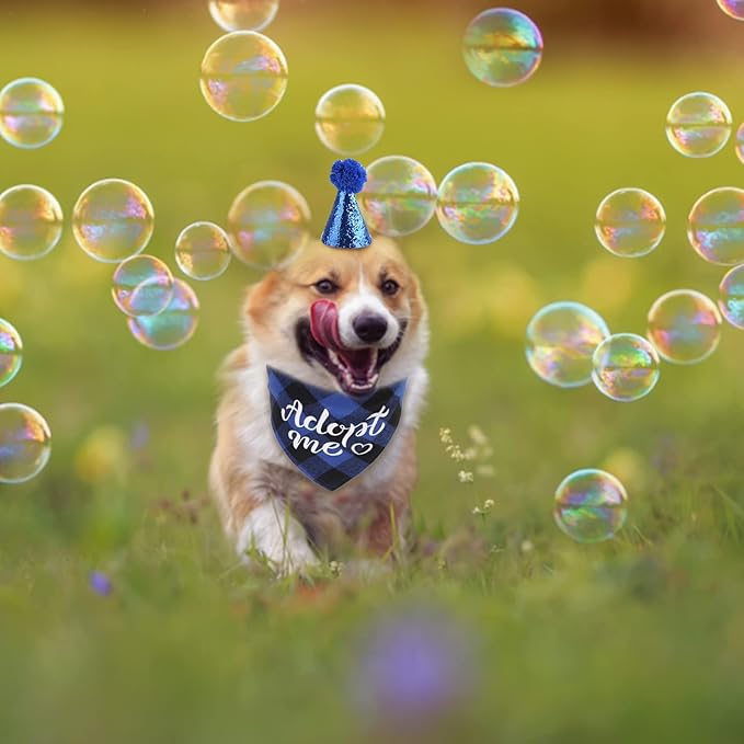 - 🍰UNIQUE DESIGN -- The bandana have a classic plaid design and printed with "It’s My gotcha Day" words, which can make your pet look more attractive. The hat and bow tie were decorated with blue glitter which make the birthday or other holiday atmosphere stronger.It has a bling effect, which will make your pet more attractive after wearing it.