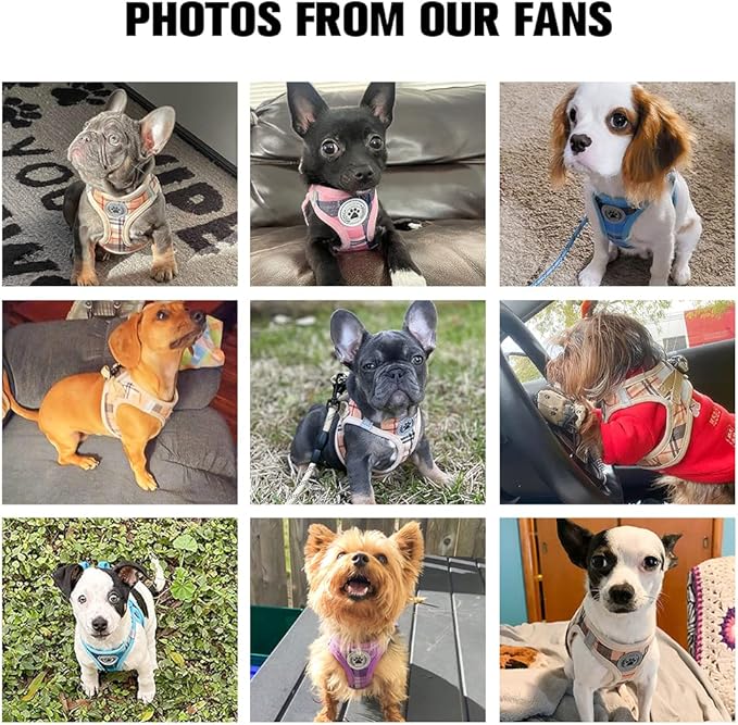 - 🐶Comfortable and Reflective ---Adjustable dog harness features colorful plaid and breathable mesh fabric, comfortable to wear and will not stick to the dog's hair. Reflective strips deign reflect ambient light in low light conditions, making you and your dog safer when walking and moving around at night without worrying about blurred vision in the dark.