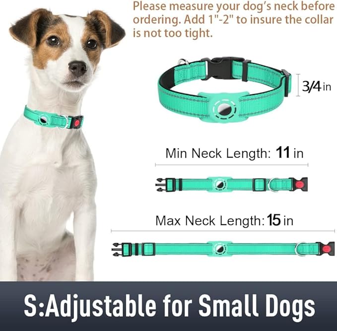 Airtag Dog Collar with AirTag Holder for Small Dogs, Reflective, Soft Padded & Safety Locking Buckle, Nylon Pet Collars Adjustable for All Breeds, Teal,S