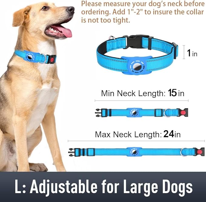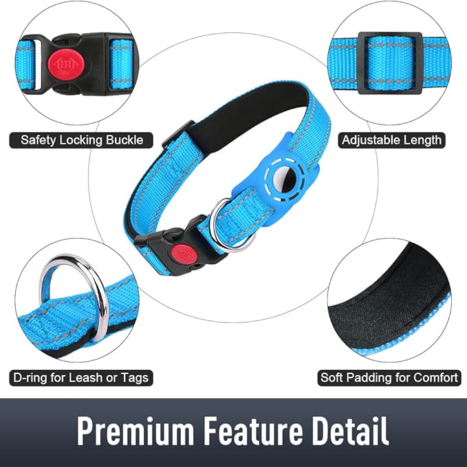 Airtag Dog Collar with AirTag Holder for Large Dogs, Reflective, Soft Padded & Safety Locking Buckle, Nylon Pet Collars Adjustable for All Breeds, SkyBlue,L
