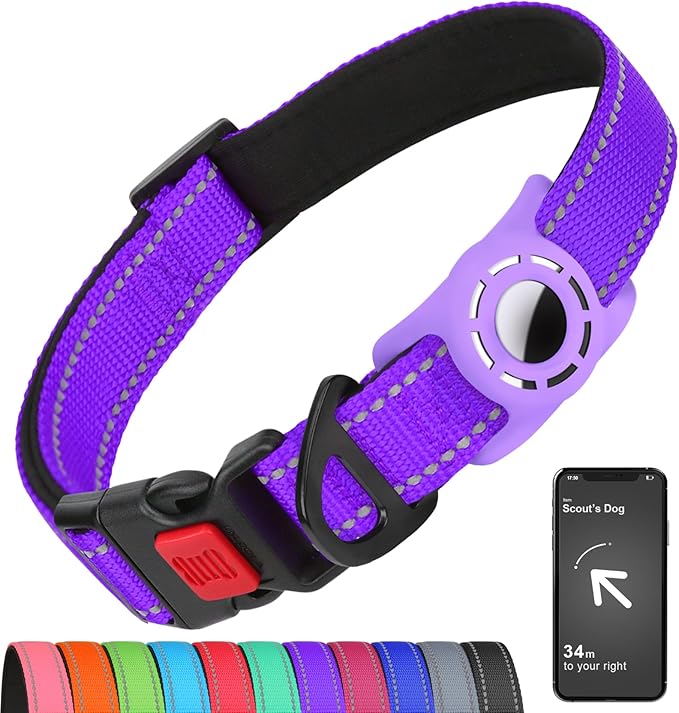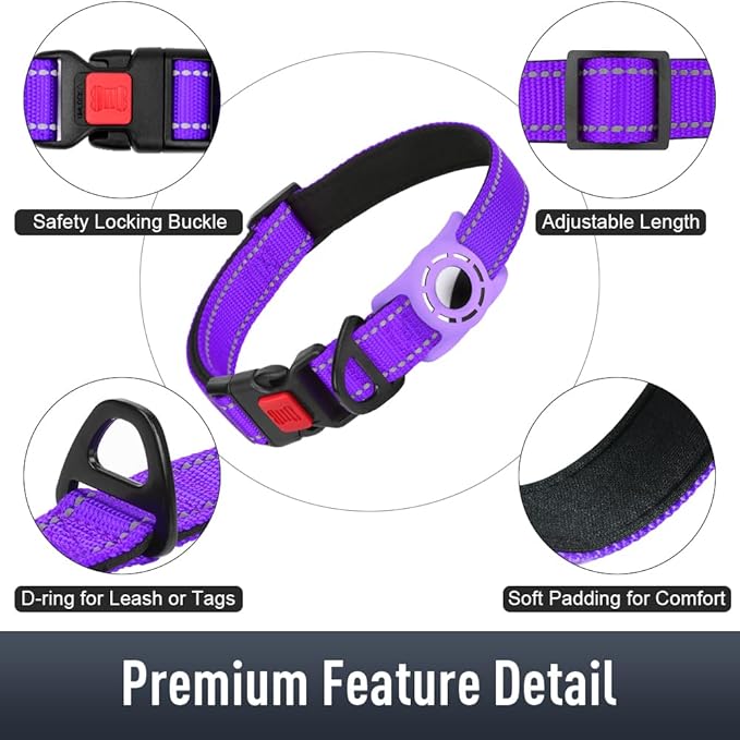 Airtag Dog Collar with AirTag Holder for Large Dogs, Reflective, Soft Padded & Safety Locking Buckle, Nylon Pet Collars Adjustable for All Breeds, Purple,L