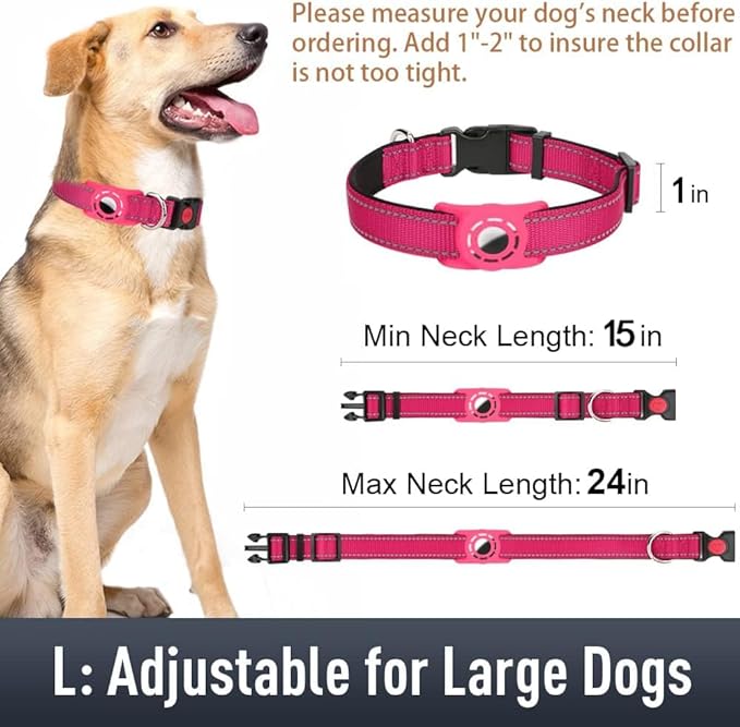 Airtag Dog Collar with AirTag Holder for Large Dogs, Reflective, Soft Padded & Safety Locking Buckle, Nylon Pet Collars Adjustable for All Breeds, Hotpink,L