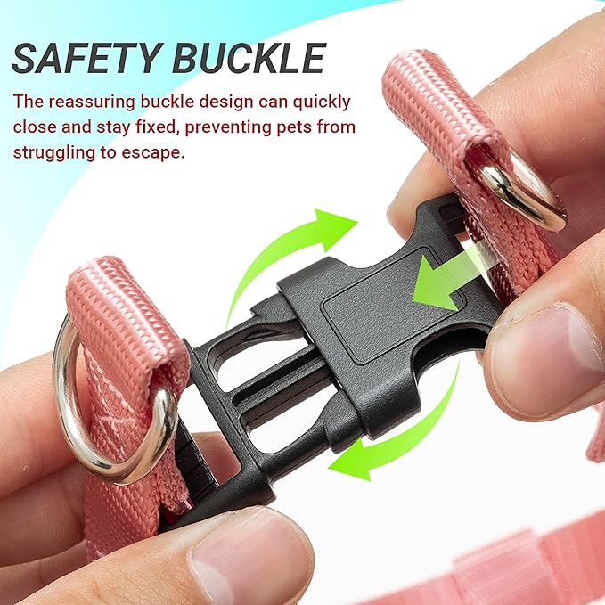 - Metal fittings make the dog harness more secure, this dog harness has two welded heavy duty O-rings attached to the nylon straps. Each nylon strap adopts a special figure-8 stitching technology, which will not fall off easily. In addition, the dog harness has a safety buckle that can be quickly closed and securely fastened, and can be quickly released when manually operated, making it easy to put on and take off. Prevent the dog from being frightened and struggling to escape