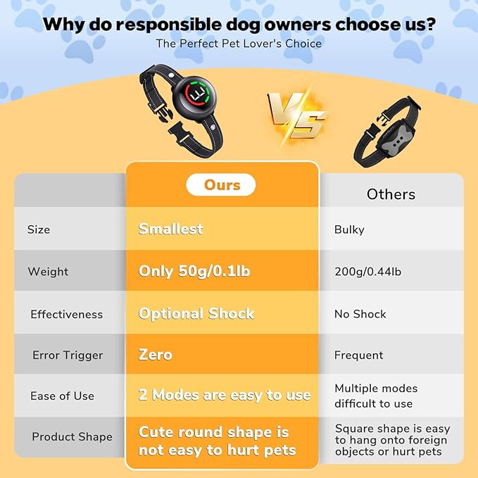 - Humane & Effective: This bark collar offers two modes: a no-shock option with beep and vibration, and a shock mode with beep, vibration, and shock. It helps curb your dog's barking effectively while minimizing stress and discomfort, providing a humane solution to correct barking behavior