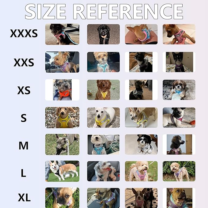 - Accurate Size: Aiitle dog vest harness and leash set is specially developed for extra small dogs to medium dogs and house cats. So our size chart is different from normal size of other brands. Before you place the order, please measure your pet's chest (full part) and neck girth. And then, you can refer to Our size Guide and size chart for the best fit. If in between sizes, please order one size up. AIITLE Dog Harness include 7 sizes XXXS-XL for Extra-Small,Small,Medium breeds from 1 -27 lbs.