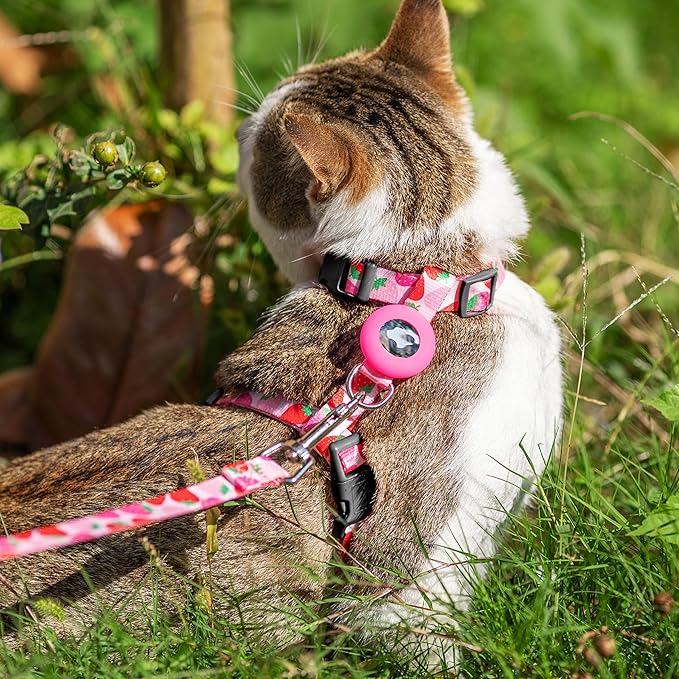 Cat Harness and Leash Escape Proof for Walking Travel Outdoor - Cute Strawberry Nylon Adjustable Cute Cat Harness Leash Set with Airtag Holder for Small Large Cats