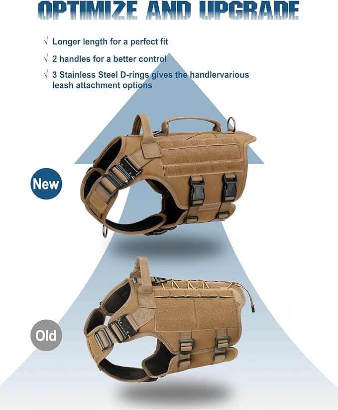 - [Molle System & Multiple Handles]: This harness has plenty of room for different Molle attachments on both sides, such as treat totes, poop bag pouches, service dog kits, military patches and name tags. The double handles are great for you to assist your dog in any position, it is much safer than pulling at a collar that is around the neck