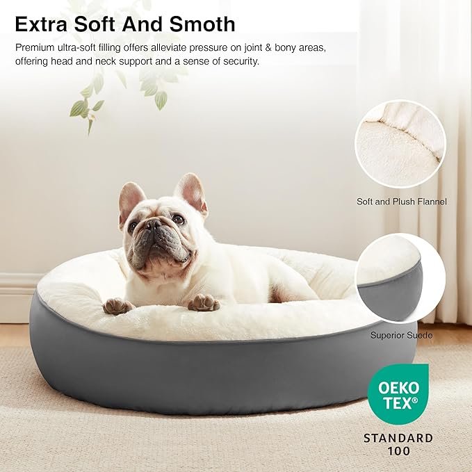 • Donut Cuddler Shape: The round dog bed allows pets to curl up while the raised rim creates a sense of security and provides head and neck support. Premium ultra-soft filling offers joint and muscle pain relief, is a great choice for elderly or sick dog pets. The 25 inch round pet bed is perfect for cat or puppy and other pets up to 30 lbs.