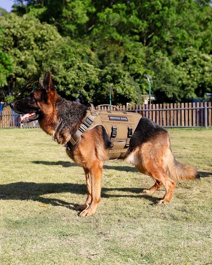 - [Dog Molle Vest & Multiple Handles]: This harness has plenty of room for different Molle attachments on both sides, such as treat totes, poop bag pouches, service dog kits. You can even add a few personal touches in the form of the velcro patches. The double handles are much safer than pulling at a collar that is around the neck, also great for you to assist your dog in any position, like help your dog into the car or up difficult sections on a hiking trail