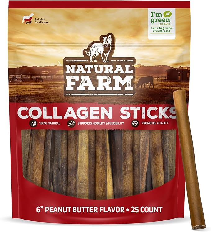 Natural Farm Peanut Butter Flavor Collagen Sticks for Dogs (6 Inch, 25 Pack), Long-Lasting Beef Collagen Sticks, Rawhide Alternative Chews with Chondroitin & Glucosamine, Low-Fat Dental Treats