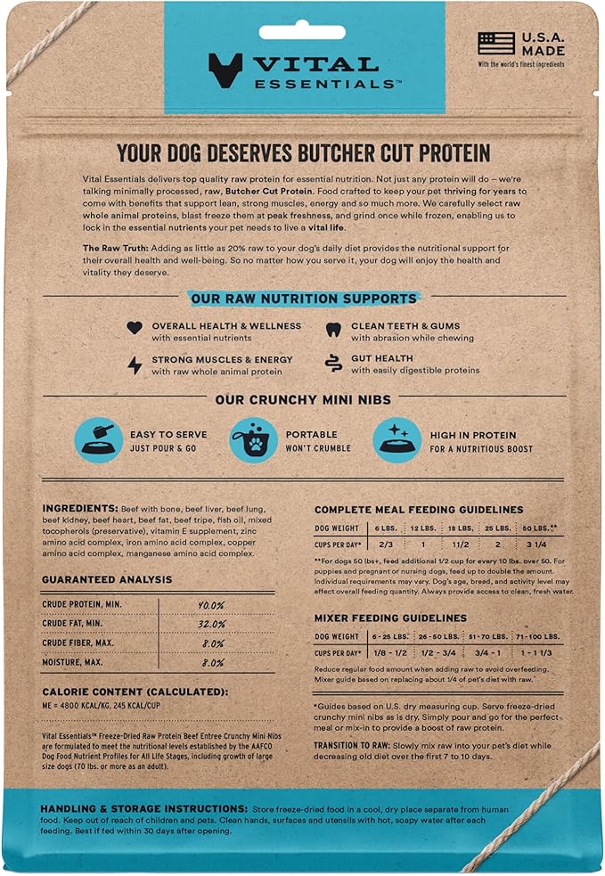 - CRUNCHY FREEZE-DRIED RAW BEEF DOG FOOD: Vital Essentials Crunchy Freeze Dried Dog Food packs more protein than industry standard into every bite to deliver the peak vitality your dog deserves, especially when compared to dehydrated dog food. This complete and balanced freeze-dried raw dog food is made with premium butcher cut beef, responsibly sourced in the USA.