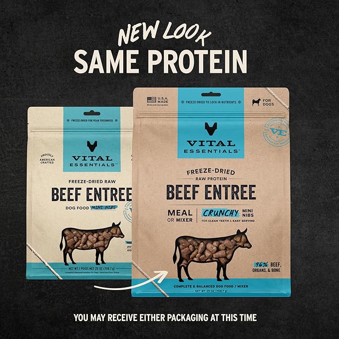 - CRUNCHY FREEZE-DRIED RAW BEEF DOG FOOD: Vital Essentials Crunchy Freeze Dried Dog Food packs more protein than industry standard into every bite to deliver the peak vitality your dog deserves, especially when compared to dehydrated dog food. This complete and balanced freeze-dried raw dog food is made with premium butcher cut beef, responsibly sourced in the USA.