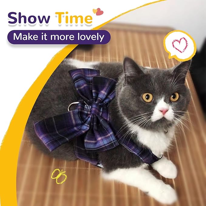 - FASHION DOGGY HARNESS WITH BOW:The unique cat harness and leash for small dogs cats matches eye catching bows, cute and adorable butterfly decoration, which is really a nice perfect gift for your dear pets. This fashion V-Neck pet harness vest also has the fashionable classic JK plaid design,when you take your beautiful and lovely pet out, your sweet baby will attract the public's attention