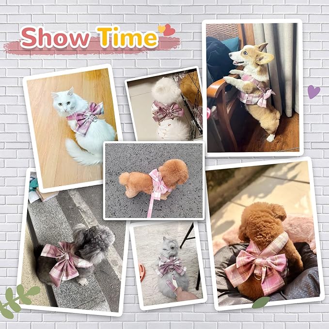 - FASHION DOGGY HARNESS WITH BOW:The unique cat harness and leash for small dogs cats matches eye catching bows, cute and adorable butterfly decoration, which is really a nice perfect gift for your dear pets. This fashion V-Neck pet harness vest also has the fashionable classic JK plaid design,when you take your beautiful and lovely pet out, your sweet baby will attract the public's attention