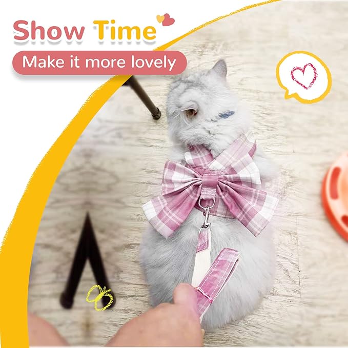 - FASHION DOGGY HARNESS WITH BOW:The unique cat harness and leash for small dogs cats matches eye catching bows, cute and adorable butterfly decoration, which is really a nice perfect gift for your dear pets. This fashion V-Neck pet harness vest also has the fashionable classic JK plaid design,when you take your beautiful and lovely pet out, your sweet baby will attract the public's attention