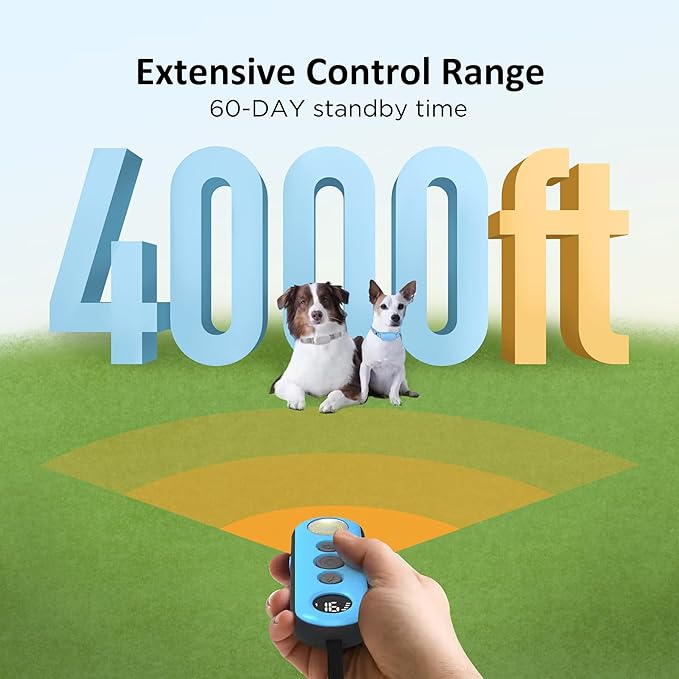 - 4000ft long range control, IPX7 waterproof. This remote can be up to 4000 feet in open areas with no obstructions. You can train your dog indoors, and outdoors easily and freely