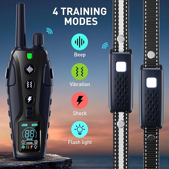 - 【Dog Training Collar with Flash Light】Two light modes of solid white light & flashing lights on receiver collar,which is super awesome for camping or night walks to keep track of the dog , just remotely turn the light on makes it easy to spot your dog,it is decently bright which makes it easy to spot your dog from a far distance even in the woods.if you dog like to take off into the woods at night,or love to hide at pee time before bed,this collar will super helpful for you.