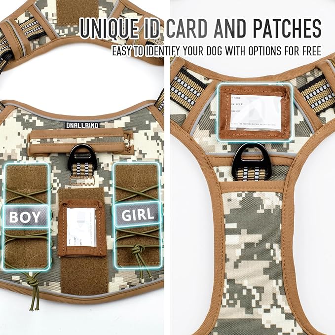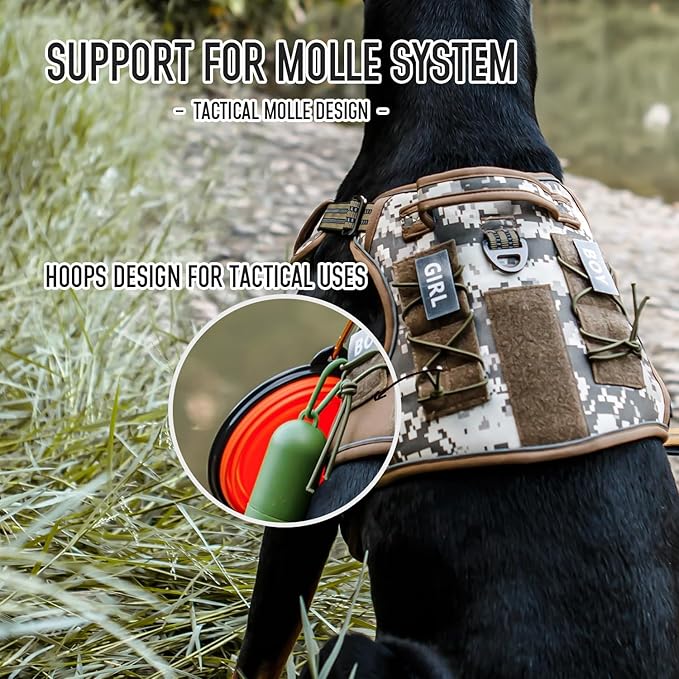 - MOLLE System Versatility: Equipped with Molle System on three sides and elastic strings, our harness offers customization. "BOY" or "GIRL" badges and Velcro ID tags allow personalization. The spacious Velcro plate lets you add your favorite badges, making it perfect for service, hunting, and outdoor adventures. You can even attach accessories like bowls, water bottles, and toys (accessories not included).