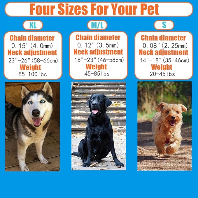- โ๏ธ๐๐ข๐๐๐ฅ๐จ๐ง๐ ๐๐ฌ๐ โซธ Measure your dogโs neck and add 1 inches. This will be your initial collar size from which you can adjust the collar by removing or adding links to achieve a comfortable snug fit (with 2 additional links). If any links wear out due to excessive use, you can also replace them.