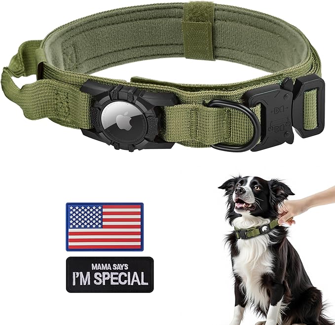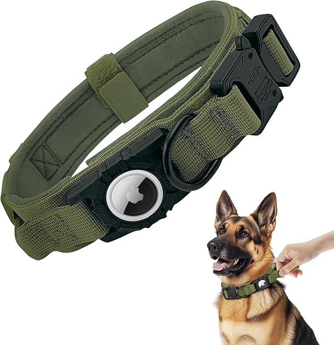 Tactical AirTag Dog Collar - Heavy Duty, Adjustable GPS Collar Compatible with Apple AirTag, with Holder & Control Handle for Medium/Large Dogs [ Green, XL ]