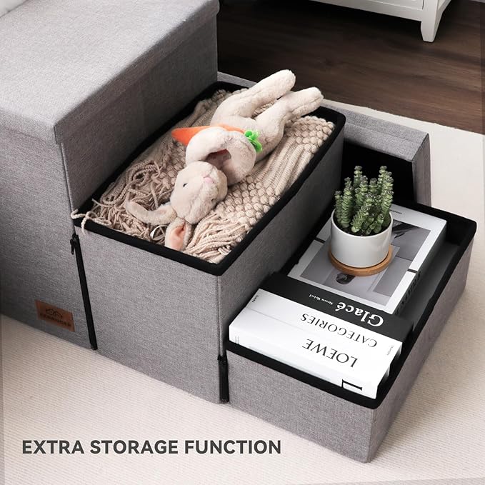 - 2-IN-1 DOG STAIRS WITH STORAGE: Zerbuger pet stairs not only provide a stable and cozy stair for your pet to climb, but also serve as a convenient large storage area total of 106QT for your pet's clothes, toys, or any other supplies. Our pet steps are covered with removable lids, Every steps are designed as storage boxes.