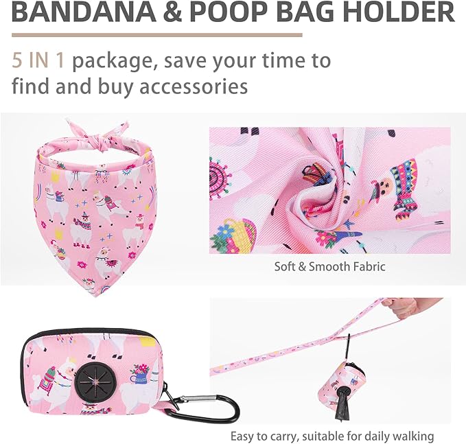 - [DOG HARNESS, COLLAR & LEASH] - The package includes three items, a walking harness, a collar, and a 4.9ft matching leash. The collar is with bell, the leash is equipped with a 360-degree rotation metal hook, and the harness is adopted with a quick-release buckle and double D-rings which are very heavy-duty. You don't need to spend extra time looking through other accessories, but you get all of these items at the same time with less money! So this is a very cost-effective set.